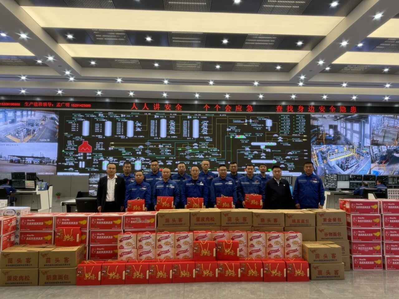 10月6日,天元公司董事、總經理喬柏,黨委委員、副總經理趙耀飛檢查節日期間安全生產工作并慰問節日期間堅守崗位的干部職工,為他們送去慰問品。喬柏一行先后前往各生產裝置區、中心控制室以及職工餐廳,查看節日期